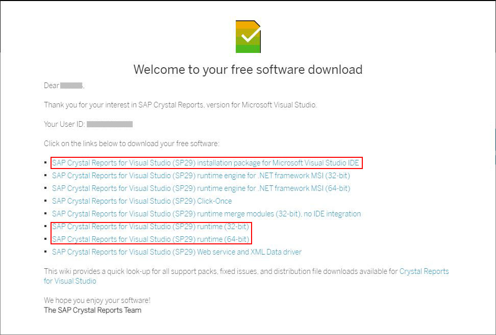 - IDE용 : CRforVS13SP29_xxx.EXE, 런타임용 : CRRuntime_(32/64)bit_xxx.msi
