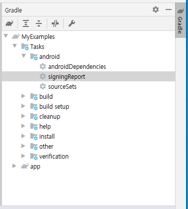 - Android Studio Gradle 뷰 → 프로젝트 선택 → Tasks → android → signingReport