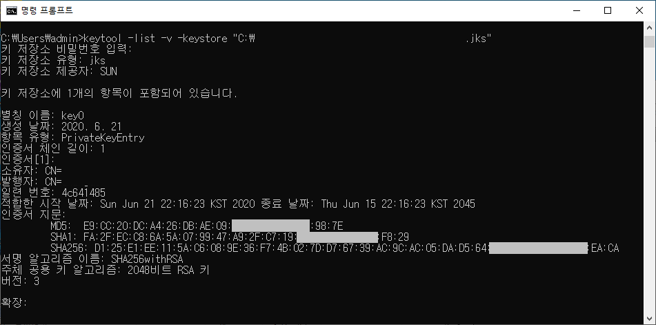 - (keytool은 java가 설치된 경로에 위치 : C:\Program Files\Java\jdk1.8.0_251\bin)