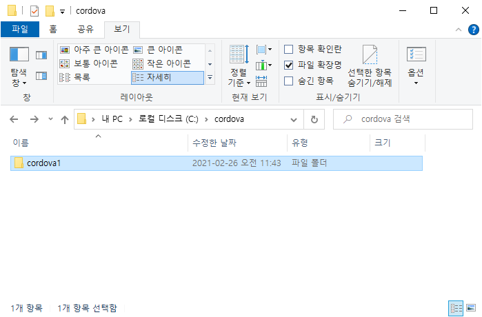 - cmd창에서 해당위치로 이동: c:\cordova\cordova1