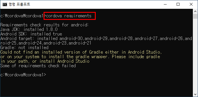 - 커맨드창 : cordova requirements