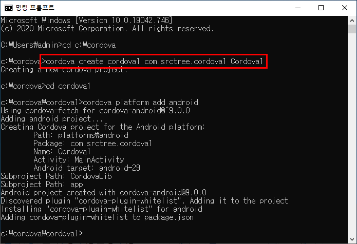 - 프로젝트 생성 : cordova create cordova1 com.srctree.cordova1 Cordova1