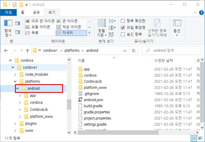 - (참고) 특정버전 지정하여 생성 : cordova platform add android@6.3.0)