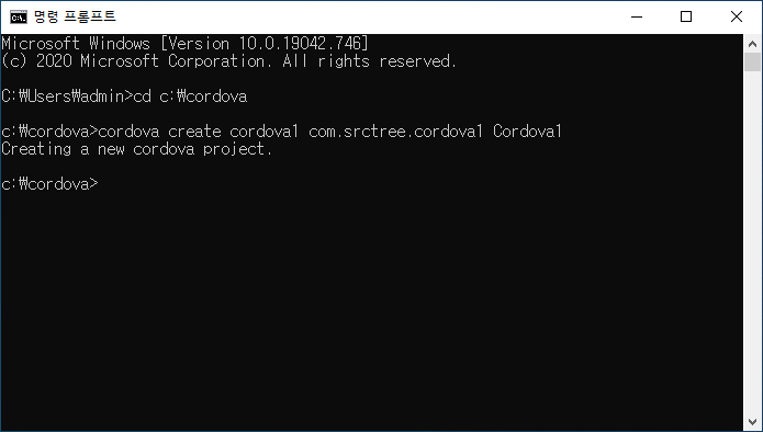 - cmd창에서 해당위치로 이동: c:\cordova